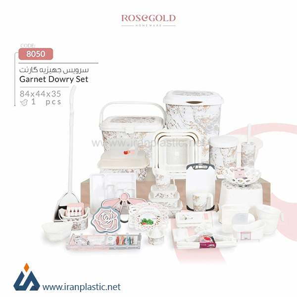 مشخصات فنی سرویس جهیزیه عروس پلاسکو 58 پارچه گارنت رزگلد پلاست 8050