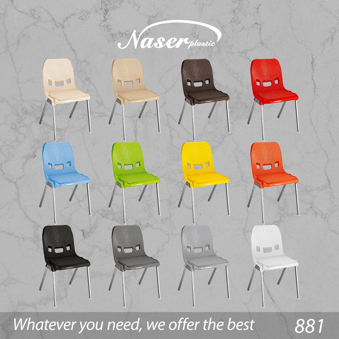 صندلی پایه فلزی ناصر پلاستیک کد 881 از جنس پلاستیک فشرده و با پایه های فلزی ضد زنگ می باشد. ابعاد این محصول 43*41*46 سانتیمتر است.