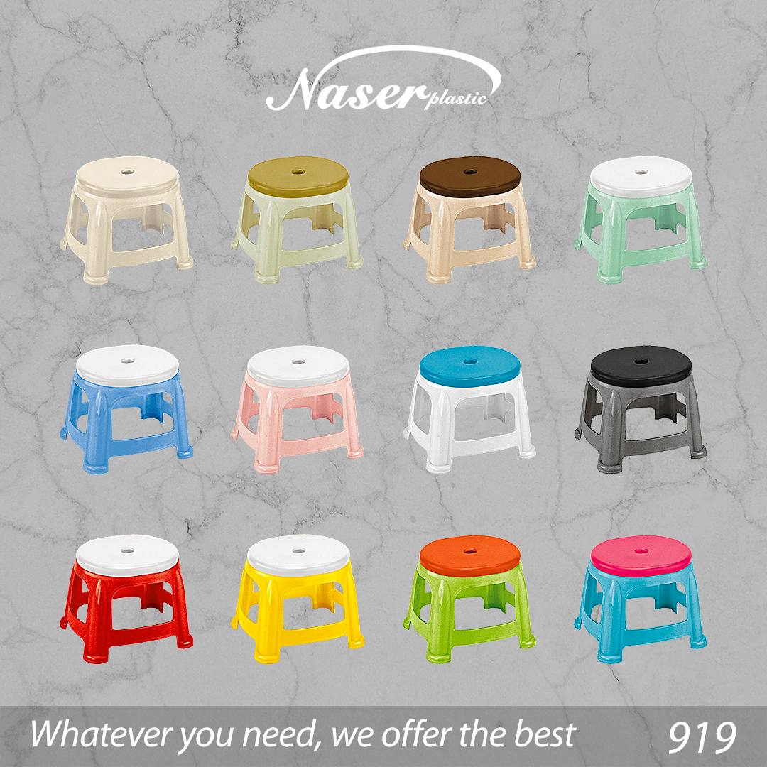 چهارپایه پلاستیکی 919 ناصر پلاستیک در نه رنگ متنوع و در ابعاد 30*25*27 سانتیمتر تولید می گردد.