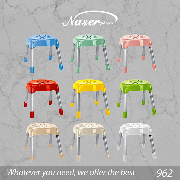 چهارپایه پلاستیکی 962 ناصر پلاستیک در نه رنگ متنوع و در ابعاد 25*25*26 سانتیمتر تولید می گردد.